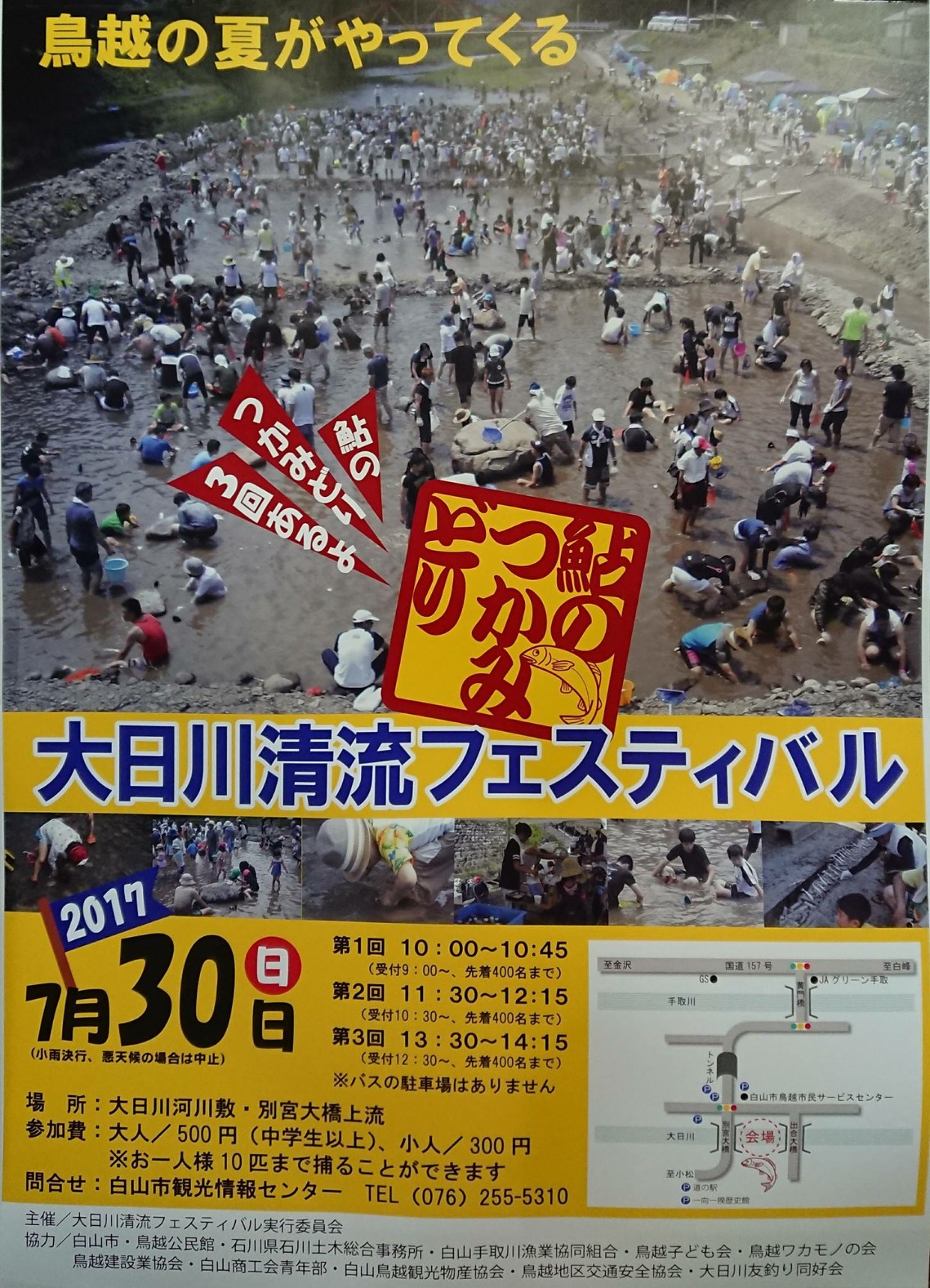 明日30日、鳥越地区で毎年恒例の鮎のつかみ取り、大日川清流フェスティバルが開催されますよ!!