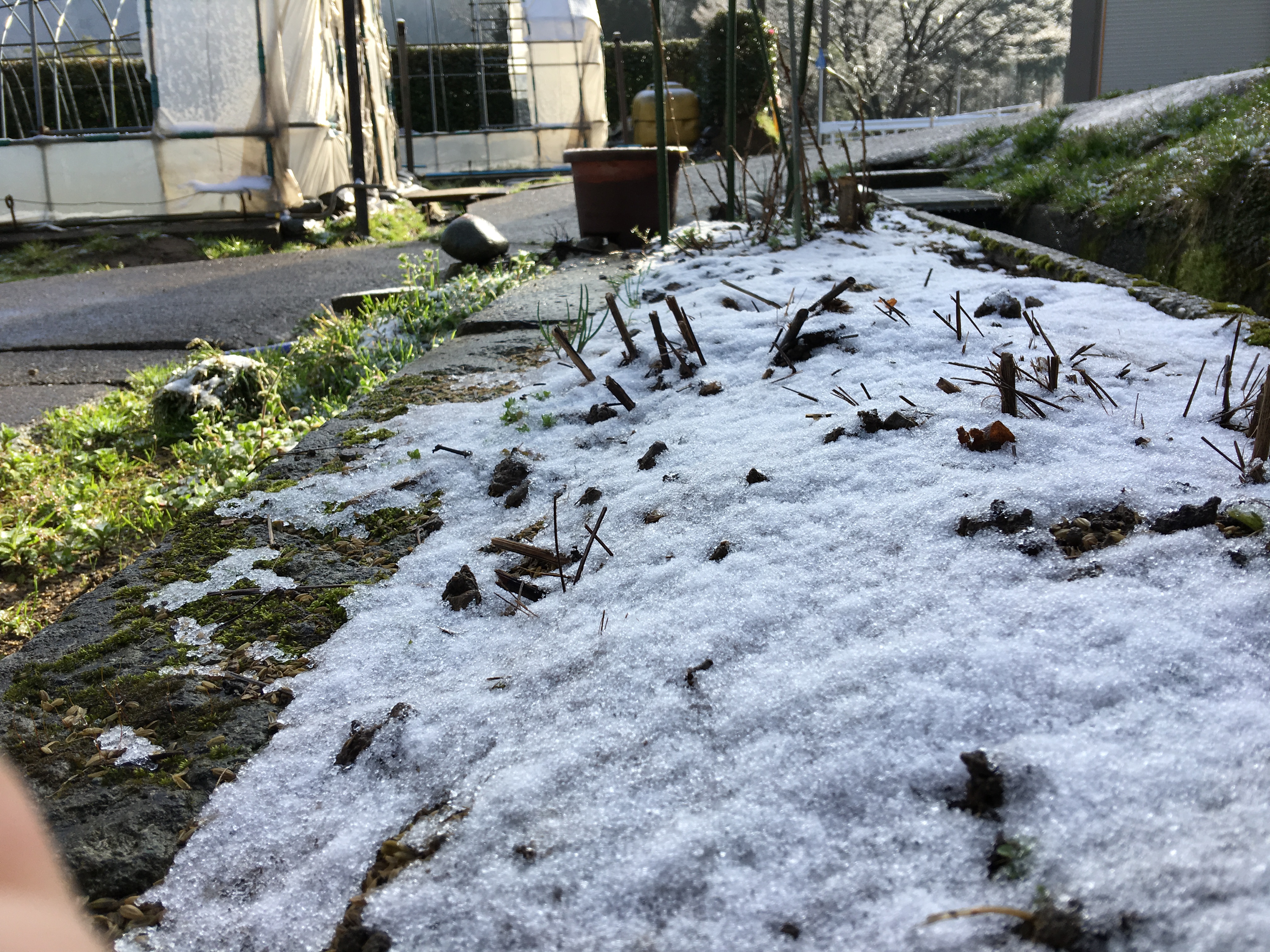 この雪があるから、中々ハウスにナイロンは張れないんですよね〜。