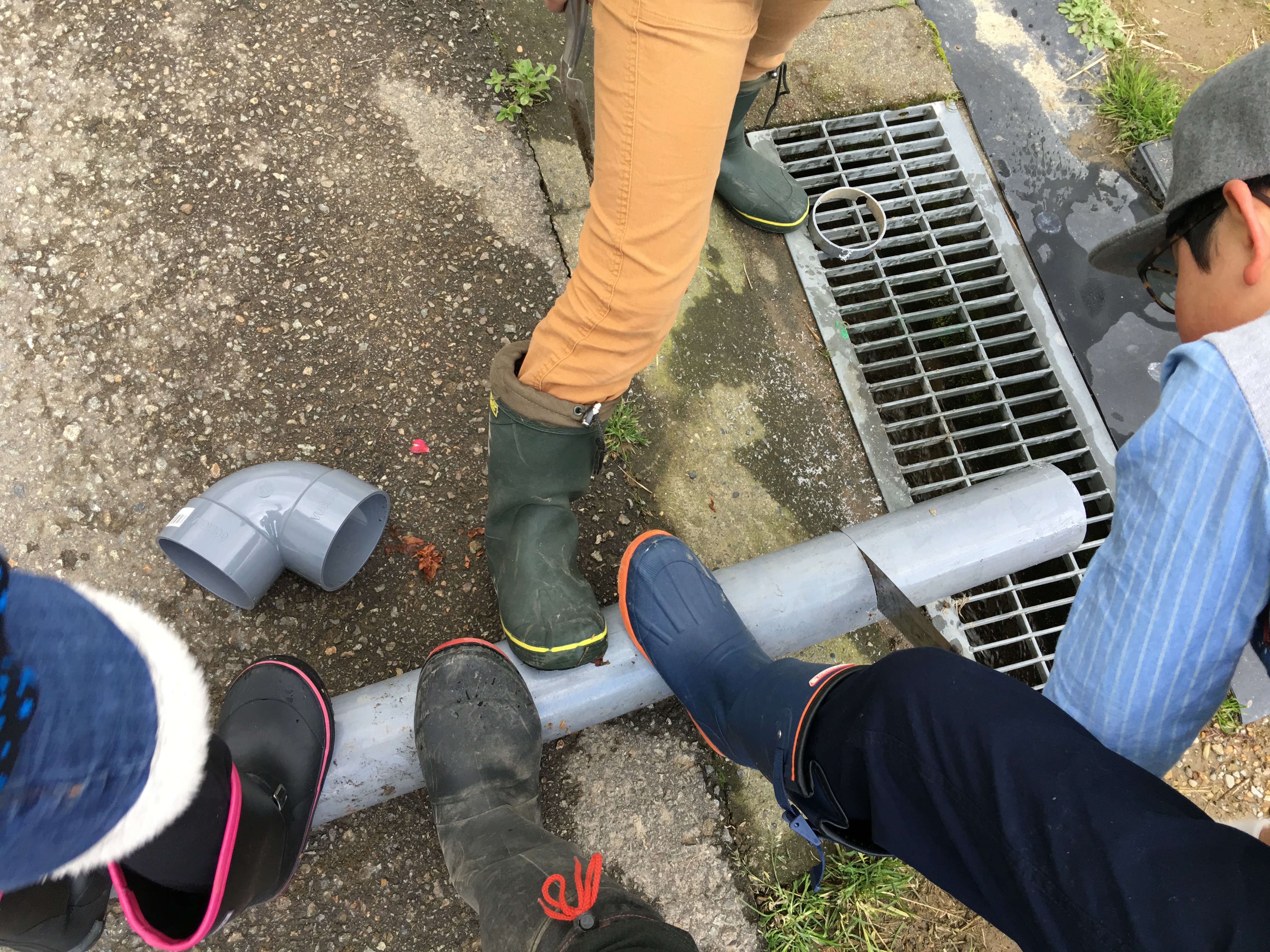 ハウス作業も準備が終わり、お次は水の入水口の塩ビパイプのカットなのですが、これまた自分プラス子供たちの足追加での過剰なまでの、固定です…。